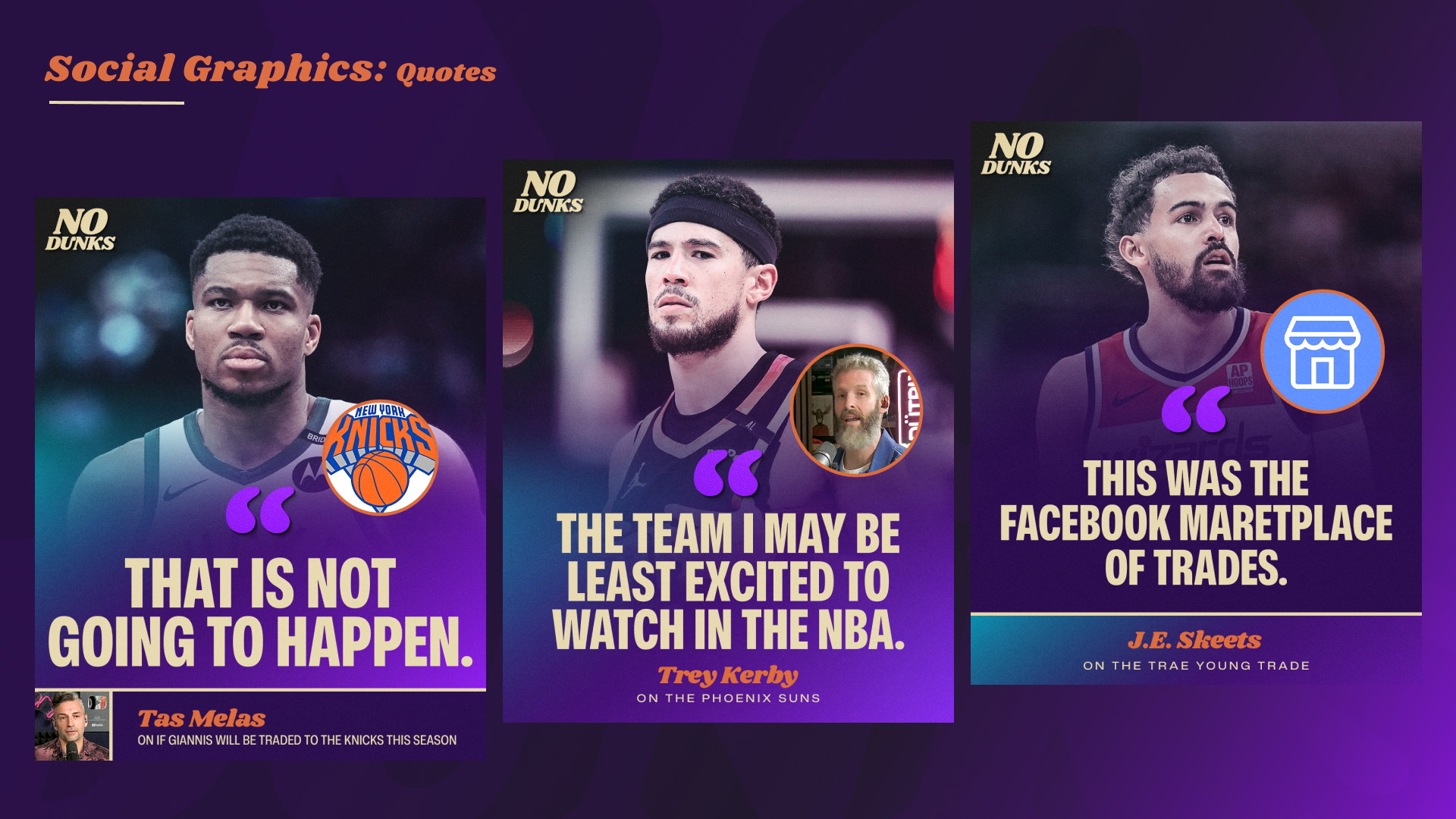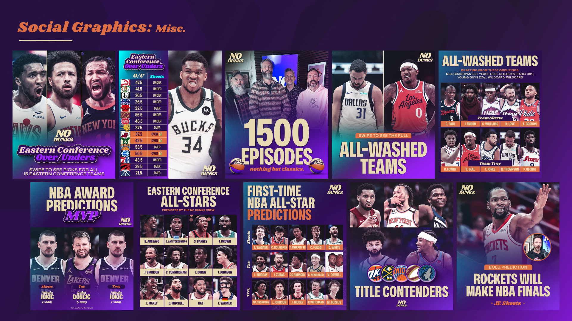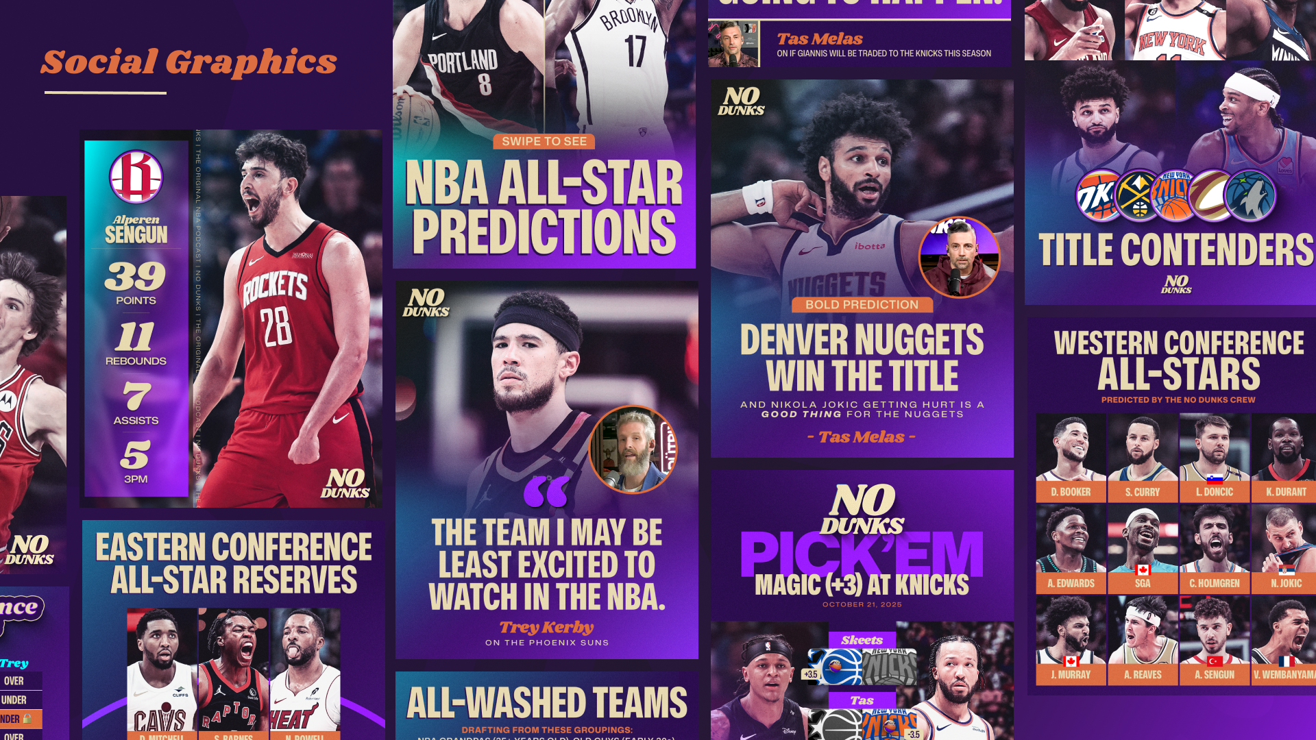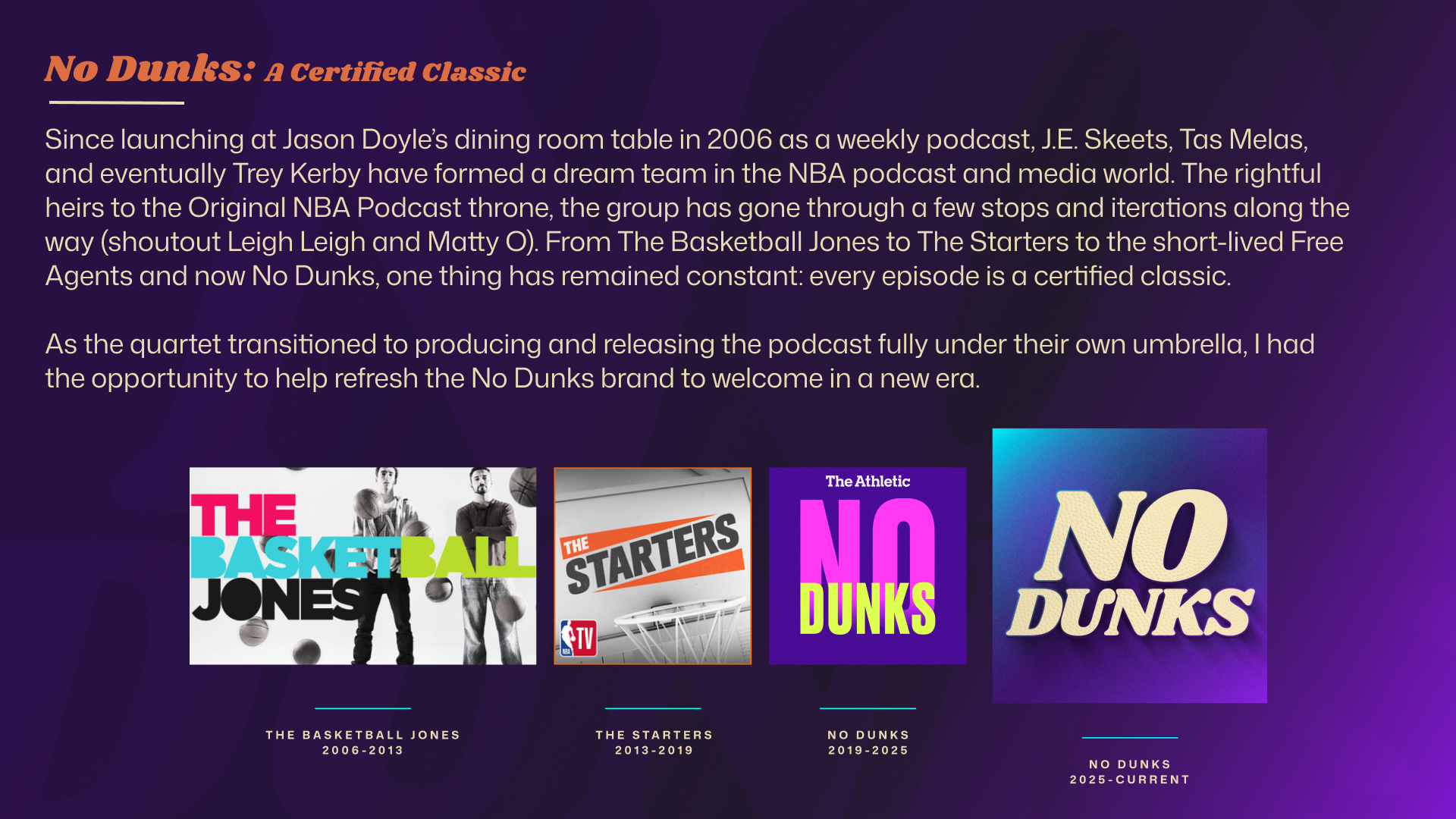 Since launching at Jason Doyle’s dining room table in 2006 as a weekly podcast, JD, J.E. Skeets, Tas Melas, and eventually Trey Kerby have formed a dream team in the NBA podcast and media world. The rightful heirs to the Original NBA Podcast throne, the group has gone through a few stops and iterations along the way (shoutout Leigh Leigh and Matty O). From The Basketball Jones to The Starters to the short-lived Free Agents and now No Dunks, one thing has remained constant: every episode is a certified classic. As the quartet transitioned to producing and releasing the podcast fully under their own umbrella, I had the opportunity to help refresh the No Dunks brand to welcome in a new era.