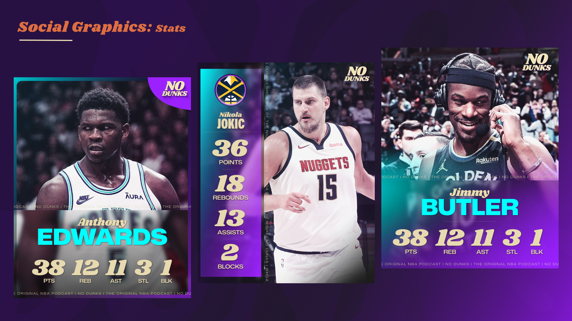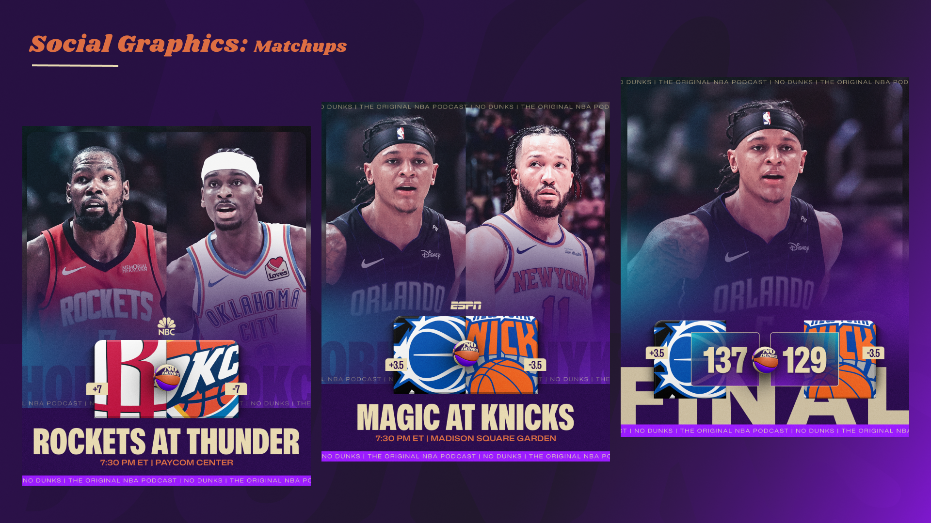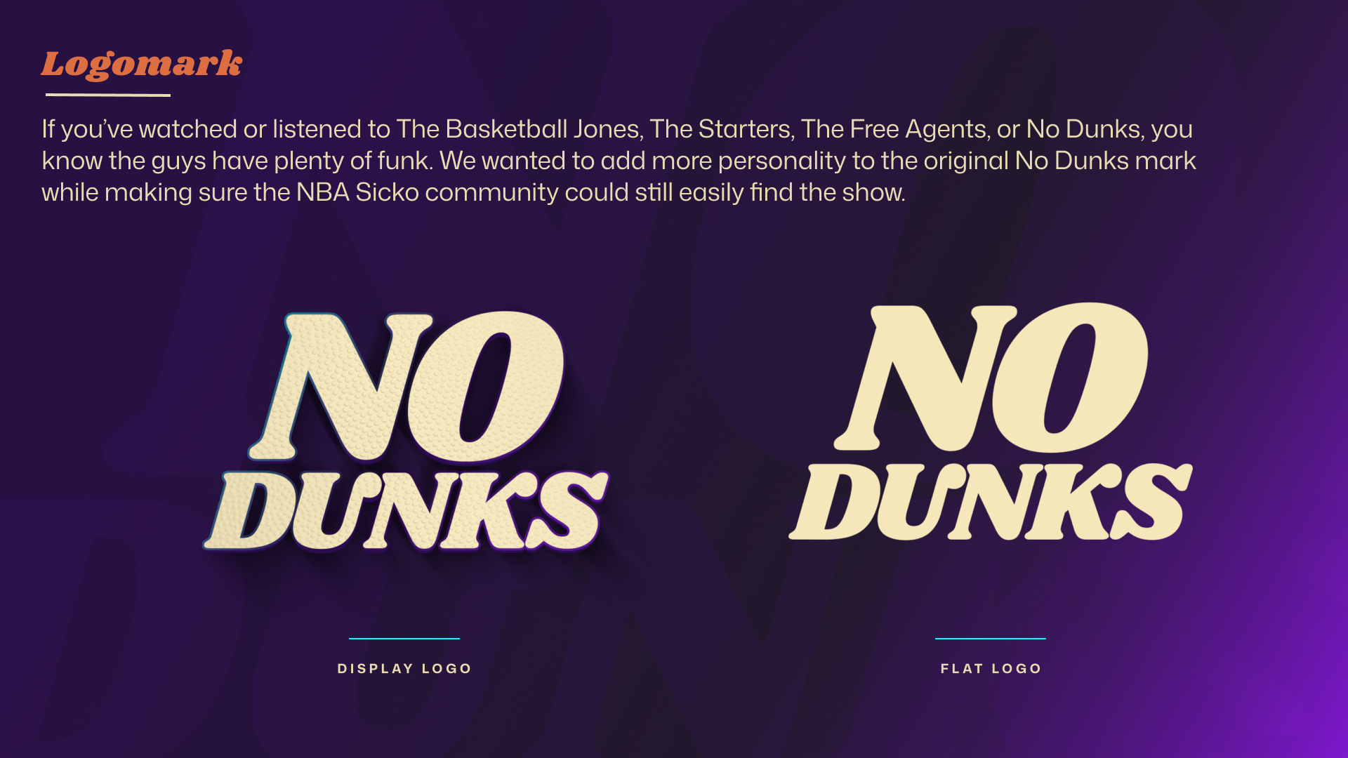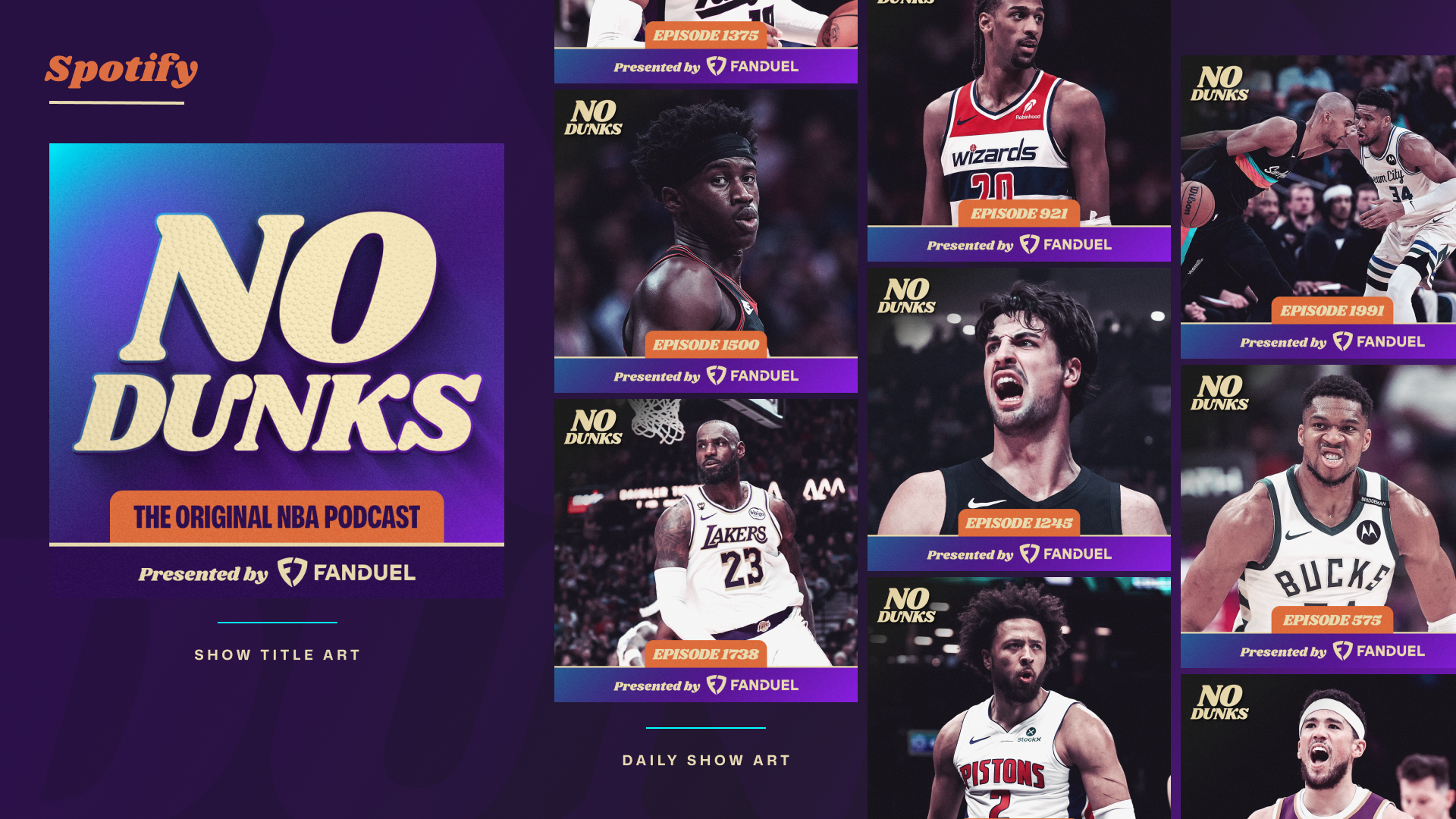 Since launching at Jason Doyle’s dining room table in 2006 as a weekly podcast, JD, J.E. Skeets, Tas Melas, and eventually Trey Kerby have formed a dream team in the NBA podcast and media world. The rightful heirs to the Original NBA Podcast throne, the group has gone through a few stops and iterations along the way (shoutout Leigh Leigh and Matty O). From The Basketball Jones to The Starters to the short-lived Free Agents and now No Dunks, one thing has remained constant: every episode is a certified classic. As the quartet transitioned to producing and releasing the podcast fully under their own umbrella, I had the opportunity to help refresh the No Dunks brand to welcome in a new era.