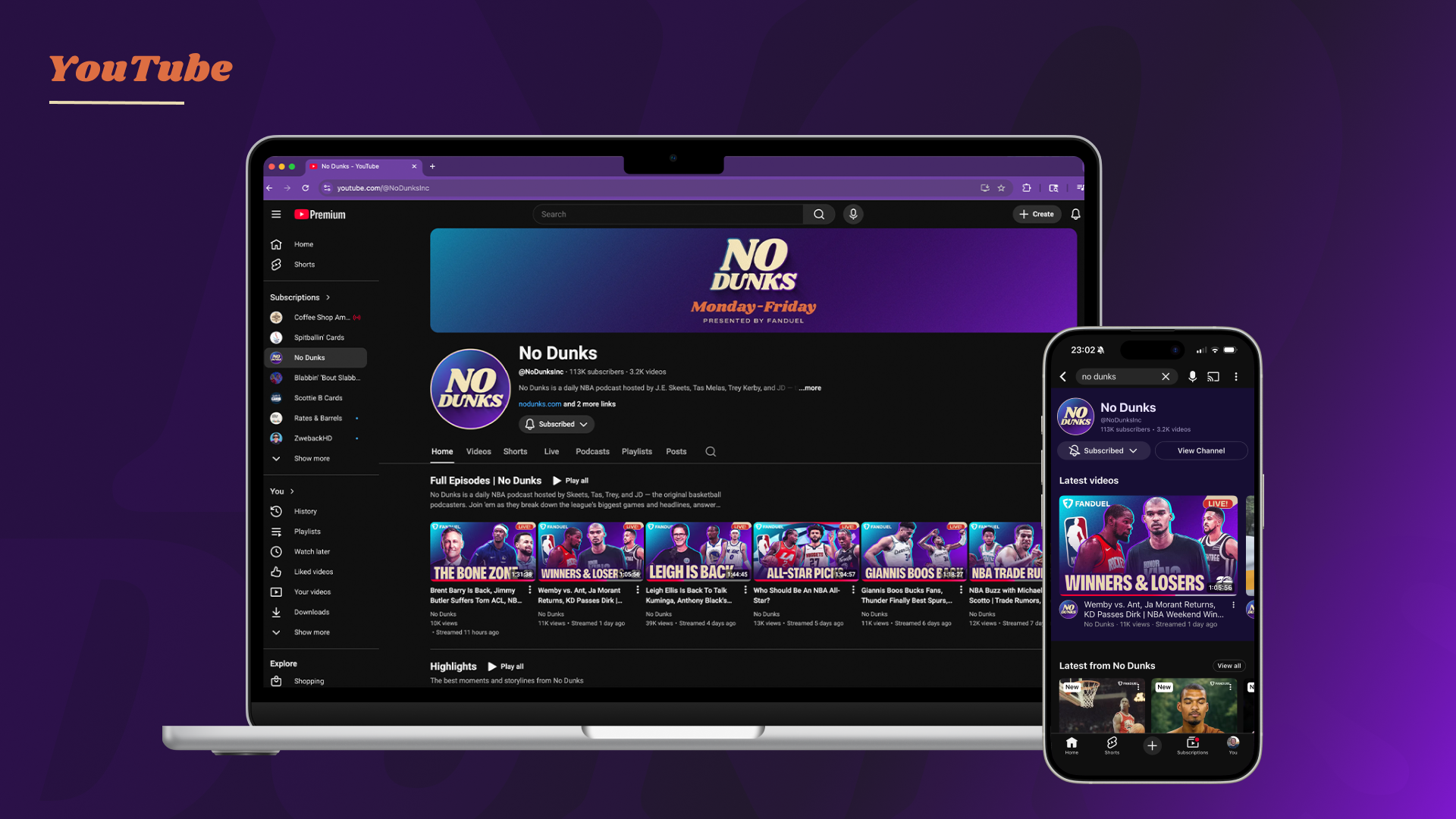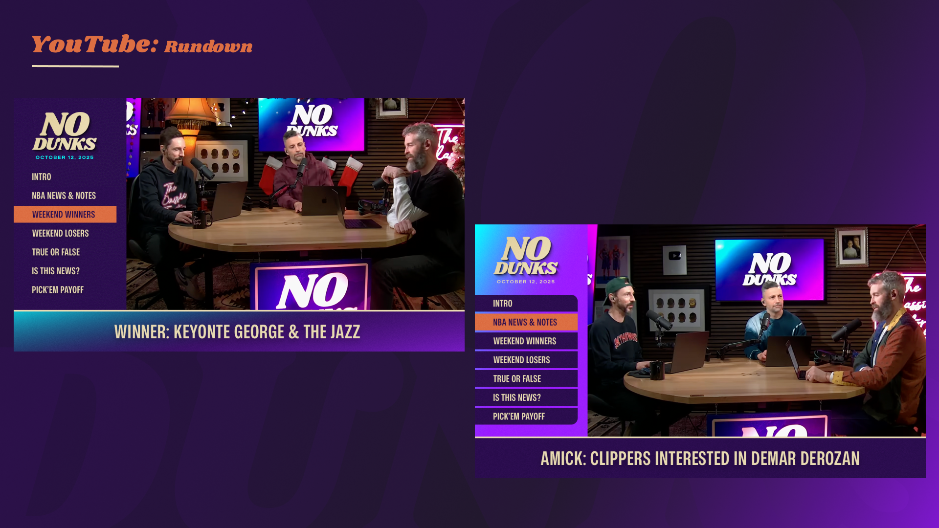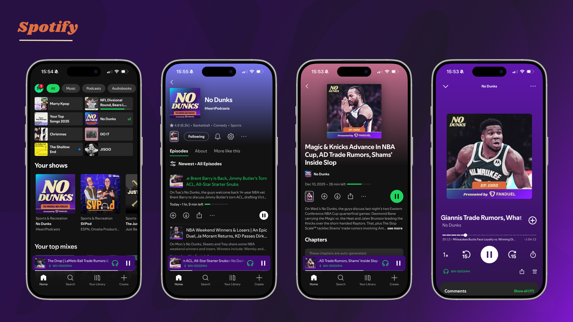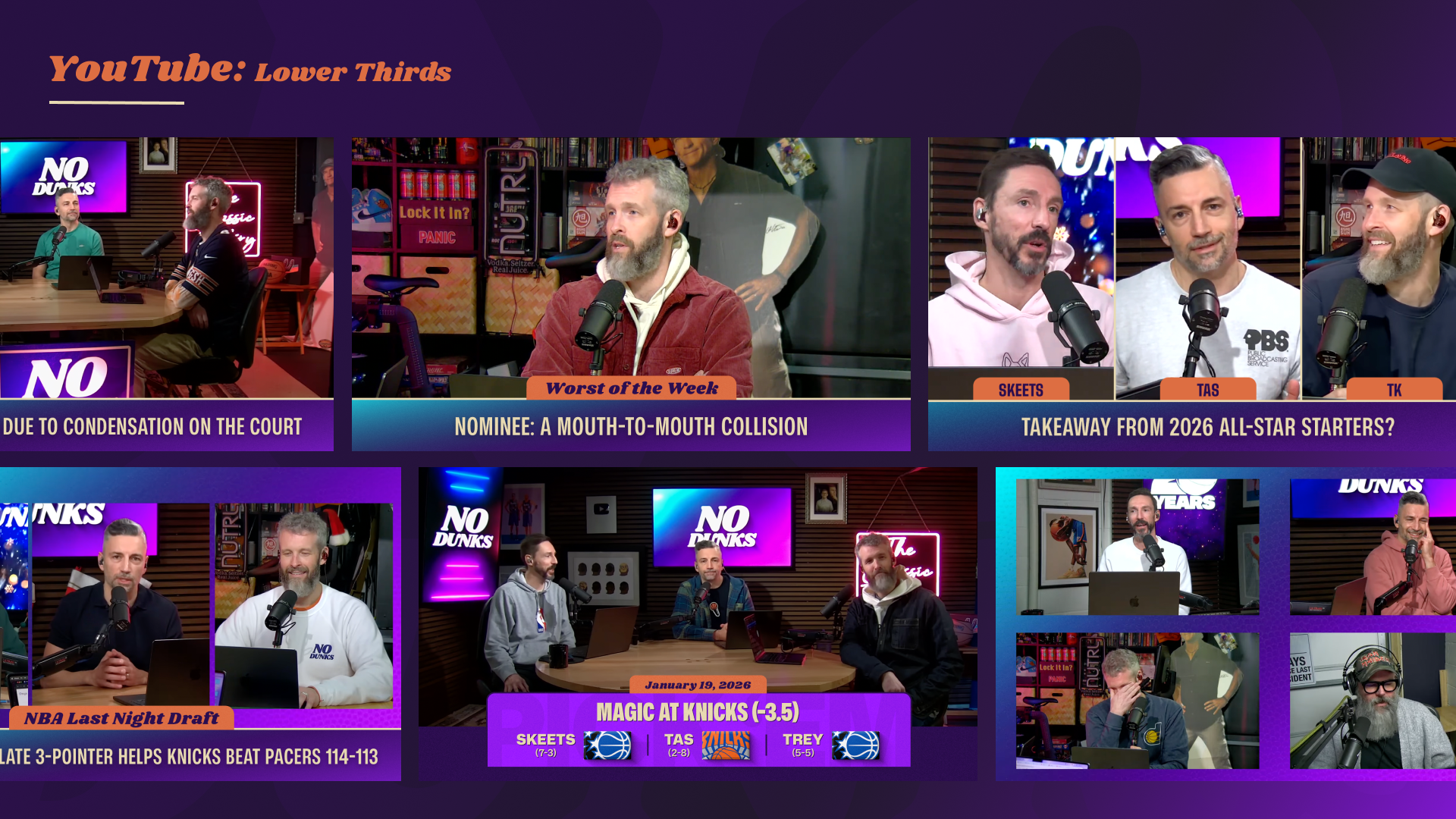 Since launching at Jason Doyle’s dining room table in 2006 as a weekly podcast, JD, J.E. Skeets, Tas Melas, and eventually Trey Kerby have formed a dream team in the NBA podcast and media world. The rightful heirs to the Original NBA Podcast throne, the group has gone through a few stops and iterations along the way (shoutout Leigh Leigh and Matty O). From The Basketball Jones to The Starters to the short-lived Free Agents and now No Dunks, one thing has remained constant: every episode is a certified classic. As the quartet transitioned to producing and releasing the podcast fully under their own umbrella, I had the opportunity to help refresh the No Dunks brand to welcome in a new era.